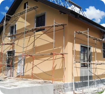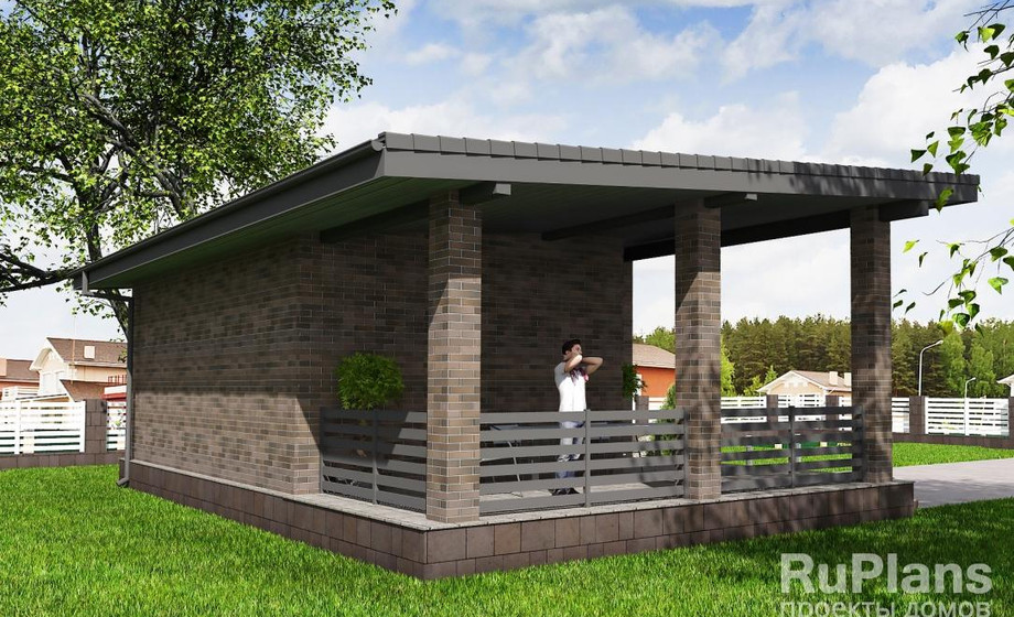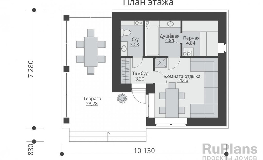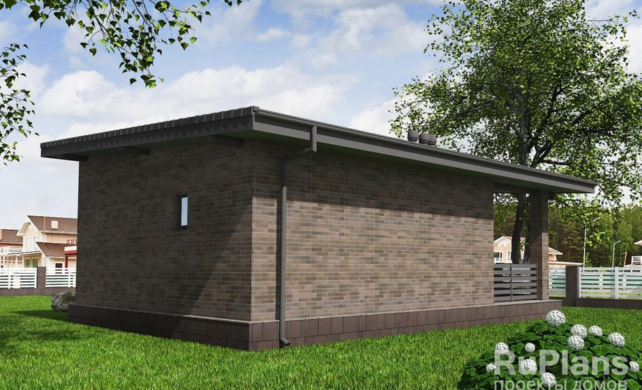 Баня с террасой с размерами здания 17,28 х 10,13 м. Фундамент - монолитная ж/б плита. Наружные стены - газобетонный блок с вент. зазором и отделкой облицовочным кирпичом. Перегородки - газобетонный блок. Пол этажа - пол по ж/б плите, чердачное перекрытие - деревянные балки. Крыша односкатная. Кровля - битумная черепица. Окна - металлопластиковые.