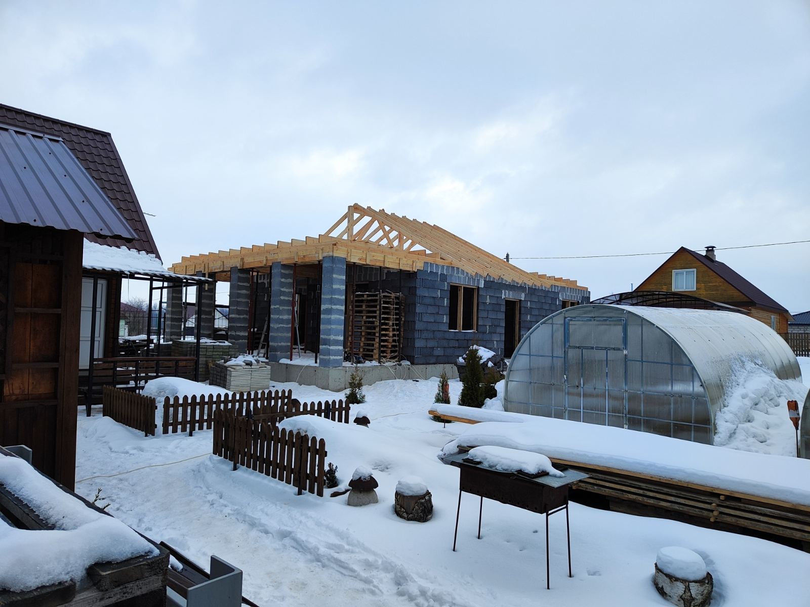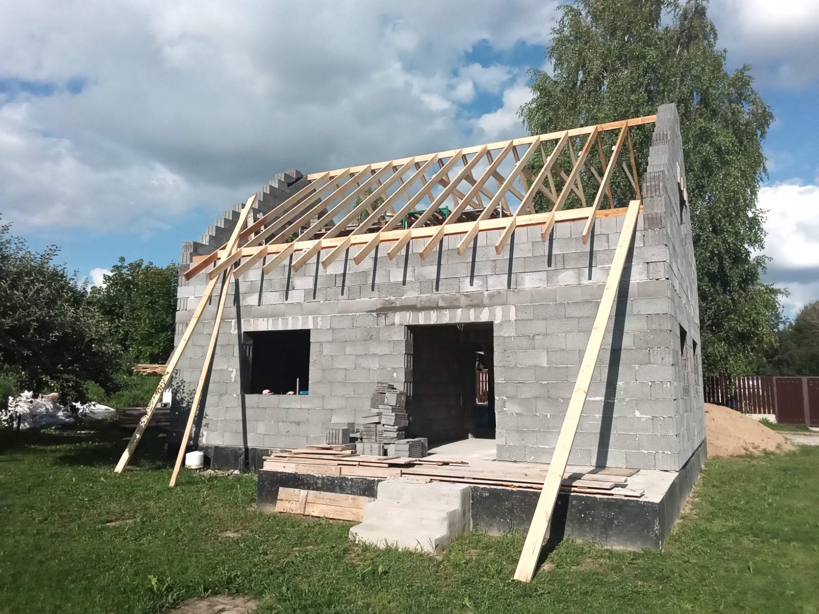 Наиболее часто применяется. Простата ее возведения и возможность экономного раскроя кровельных материалов делает этот вариант экономичным. Конструкция используется для дачных домиков, хозяйственных построек, небольших коттеджей.
