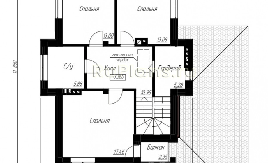 Модель проекта индивидуального двухэтажного жилого дома с размерами здания 13,58 x 11,88 м. Наружная отделка здания – декоративные панели. Фундамент – ленточный монолитный ж/б. Наружные стены – монолитный ж/б каркас с заполением теплоблоком. Перегородки - забутовочный кирпич. Пол погреба - пол по гркнту. Пол 1 этажа, межэтажное перекрытие - монолитная ж/б плита. Чердачное перекрытие - деревянные балки. Крыша многоскатная. Кровля – металлочерепица. Окна — металлопластиковые.