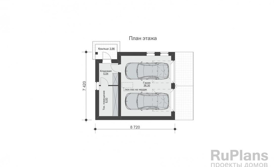 Эскизный проект одноэтажного гаража на две машины с мастерской с размерами здания 7,42 х 8,72 м. Фундамент – монолитная ж/б стена в грунте (щелевой) Наружные стены – газобетонные блоки с отделкой штукатуркой или клинкерной плиткой. Внутренние стены – газобетонные блоки. Перегородки – газобетонные блоки. Пол этажа – пол по грунту. Чердачное перекрытие – деревянные балки с теплошумоизоляцией в межбалочном пространстве. Крыша двухскатная. Кровля – металлочерепица. Окна — металлопластиковые.