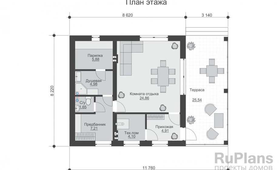 - Rg6200 - Одноэтажная баня с террасой и комнатой отдыха