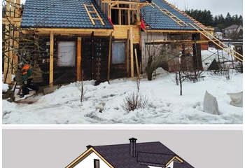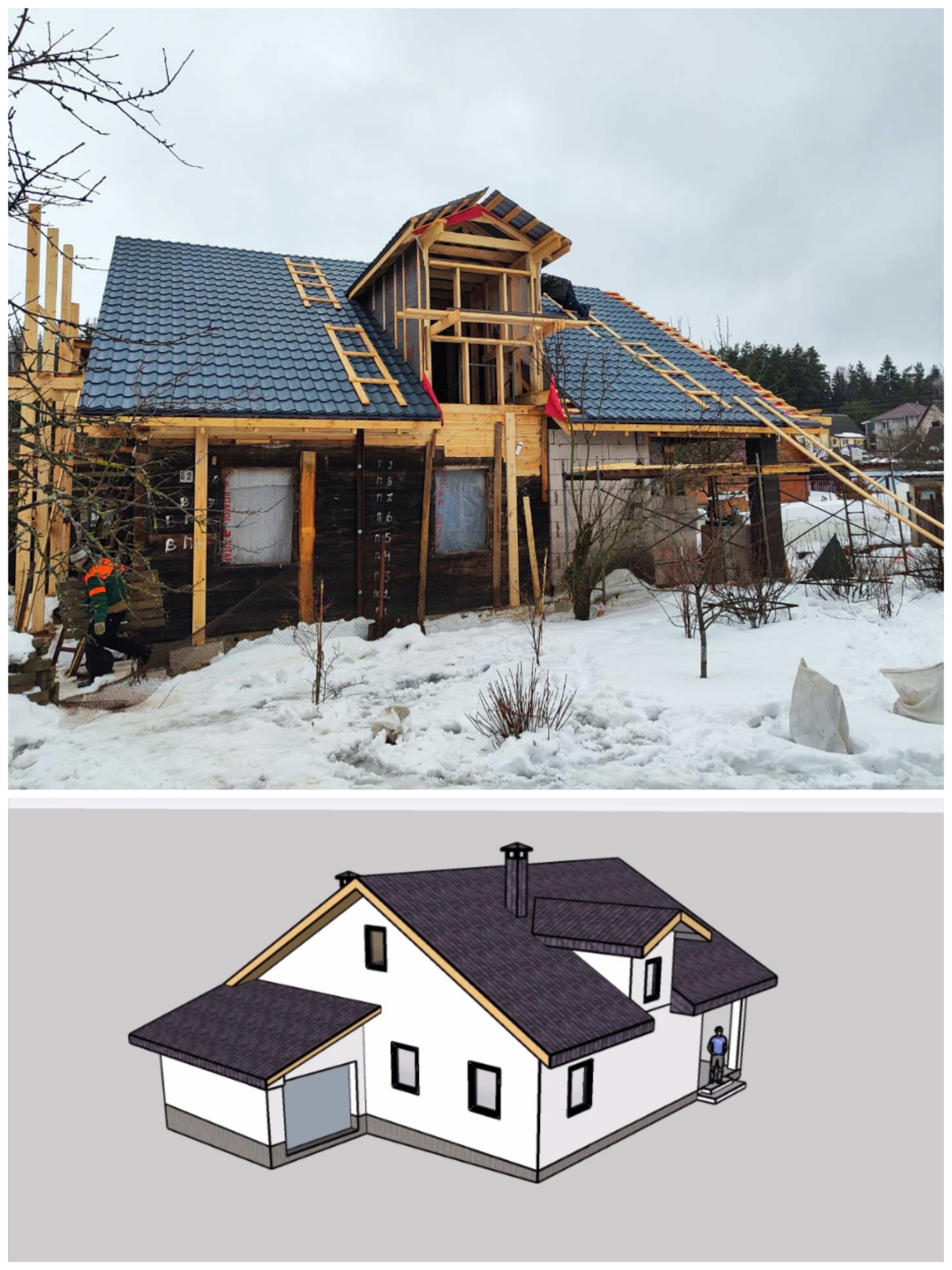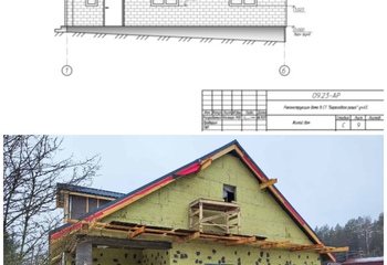 Объект построен в садовом товариществе Минского района. Двухэтажный дом возводился “под ключ”(реконструкция). На объекте фундамент -монолитный свайно- ростверковый железобетонный новой части, старый столбчатый с лентами. Кладка стен выполнена из газосиликатного блока, утепление.