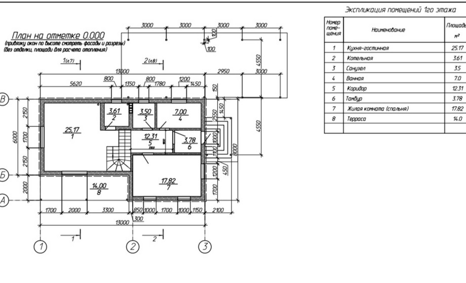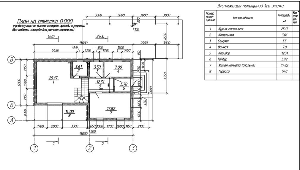 В доме размещены 4 жилых комнаты, кухня-гостиная-25,17, топочная-3,61, санузел-3,5, ванная-7, коридор-12, жилая комната 1 эт-18, жилая комната 2 эт-25; 17; 13 (три спальни), терраса -14.