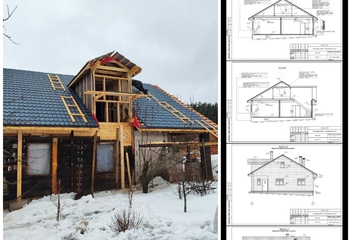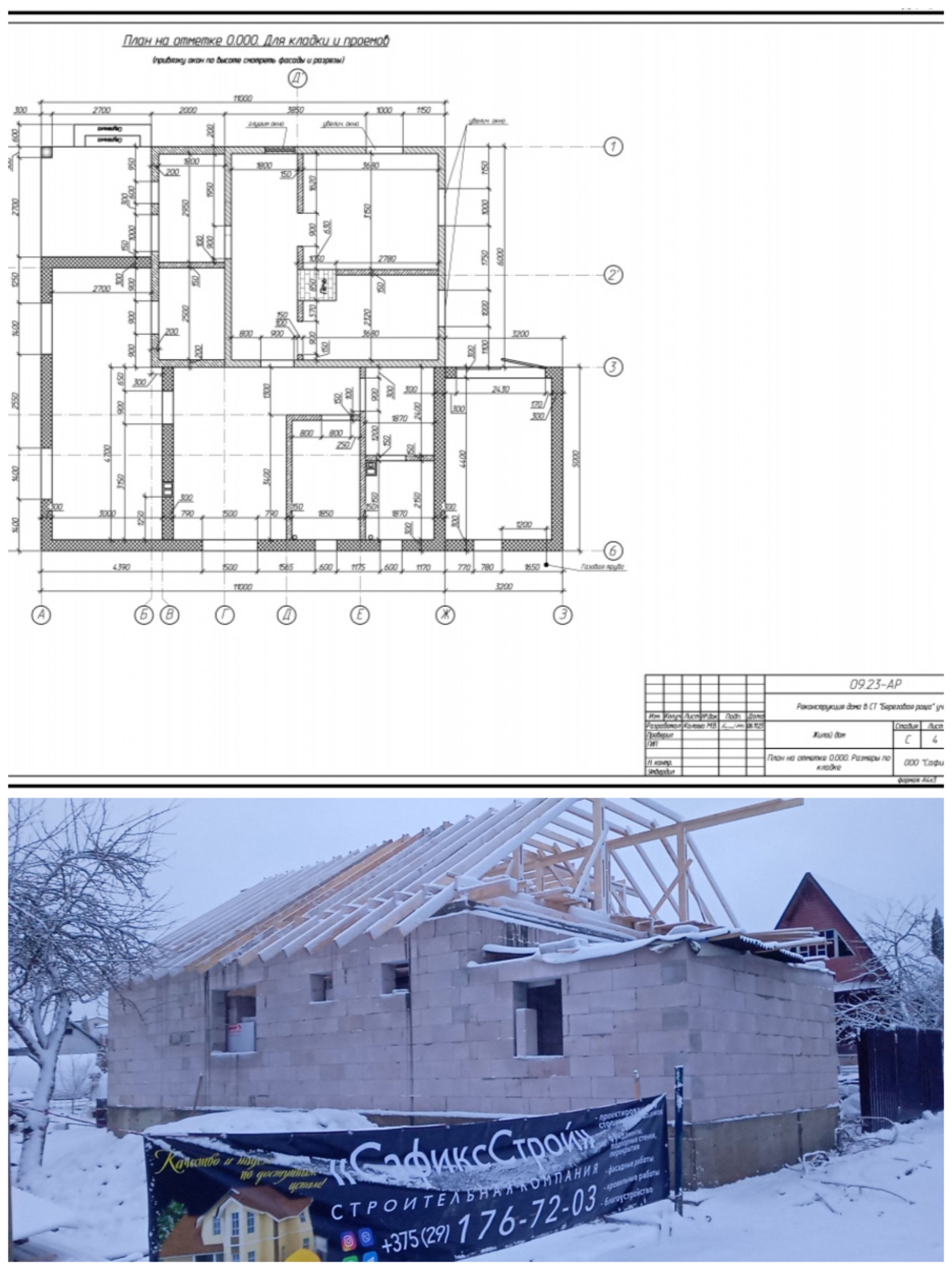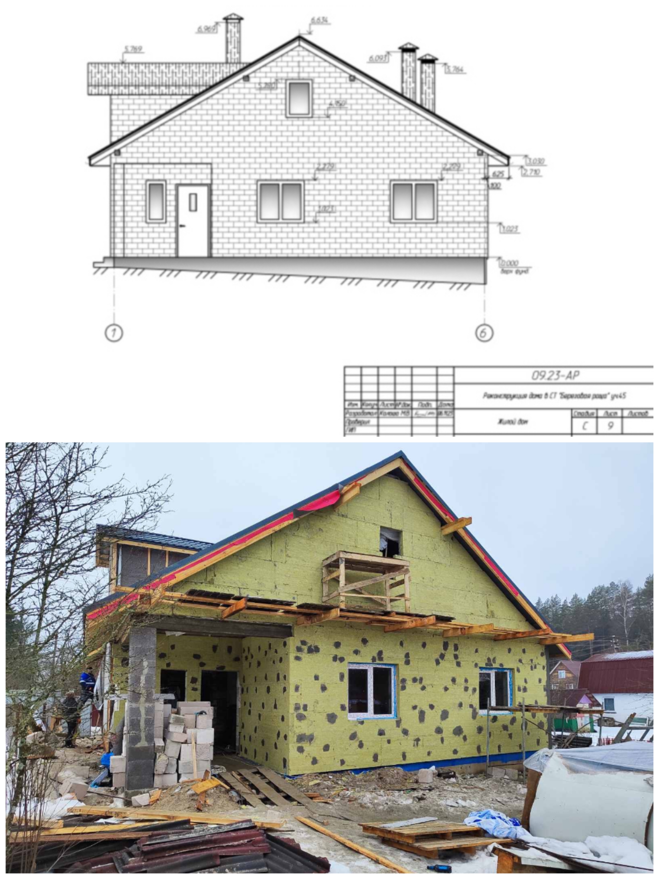 Объект построен в садовом товариществе Минского района. Двухэтажный дом возводился “под ключ”(реконструкция). На объекте фундамент -монолитный свайно- ростверковый железобетонный новой части, старый столбчатый с лентами. Кладка стен выполнена из газосиликатного блока, утепление.